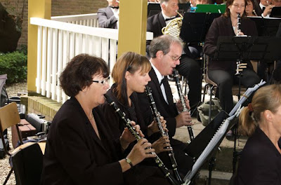 I woke up at 8 a.m. but couldn’t get out of bed! I opened the curtain and to my horror it was raining! A shower woke me up and at 9 us three ladies were all dressed and pampered, ready to go down. Breakfast was really nice and certainly lived up to my standards of good food. Soft yoghurt with muesli and fruit to start off. Then I had one bread-roll with scrambled egg to make sure I wouldn’t get hungry for quite awhile. The sky started to clear out as well while we were eating. After breakfast we changed to our formal concert outfits and drove to Goes. We were really early. The concert would start at noon, and it was just 10:45 a.m. It was okay by me, another opportunity to take pictures! Some other early birds from the orchestra were also there, and, of course, the people from the rhythm section were already unloading their stuff (the drums, timpani, tubular bell, bass drum etc). I’m so glad I only have to bring a small clarinet-case with me. The sun was shining and that gave the Manhuistuin a very nice atmosphere. The Manhuistuin is a garden surrounded by buildings, which gives it a secluded feeling. You wouldn’t guess there was a garden behind those buildings if you didn’t know it. The stage is too small for our orchestra so some of us had to sit in front of it.