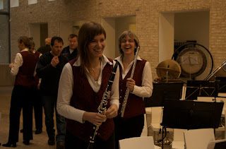 Het programma van de dag was wel wat rommelig, we moesten van 1 tot kwart over 1 een kort blokje spelen, dan 15 minuten pauze en weer een kort blokje. Daarna kwam zou er een toespraak van de burgemeester en aanverwanten plaatsvinden, alvorens we weer een tijdje mochten blazen. Terwijl we begonnen te spelen druppelden de mensen langzaam binnen, en iedere keer nadat we klaar waren met een nummer mochten we blij zijn als er drie mensen applaudisseerden. Dat soort dingen zijn meestal jammer, maar deze keer stoorde ik me er totaal niet aan. Het spelen ging namelijk ontzettend goed, dus daar genoot ik met volle teugen van. De akoestiek in de hal, waar ze ons hadden neergezet, was verrassend goed. Ik hoorde mezelf amper spelen, maar het totale geluid was zeer aangenaam. We moesten er alleen voor waken om niet te hard te spelen, met name de trombonisten hadden er duidelijk zin in en scheurden af en toe als een gek.