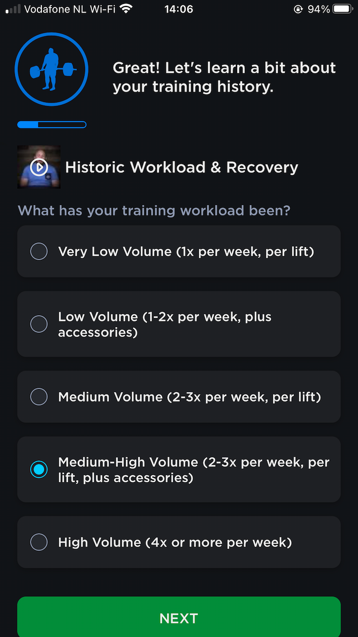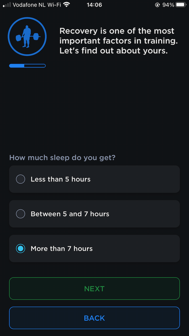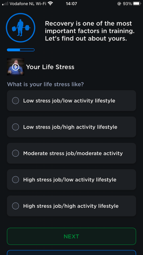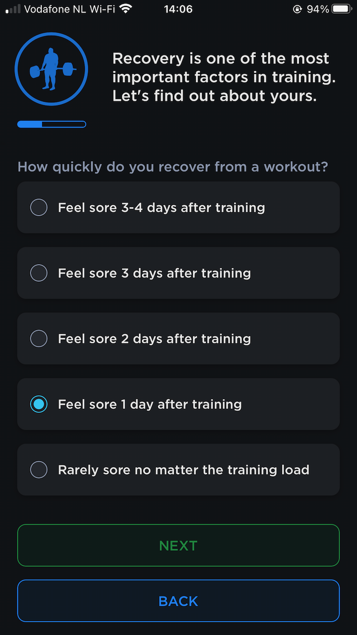 Apparently, my training age is super young, I’m only a powerlifter for one year now. The next beginner-unfriendly hint is that you have to tell the app your historic workload. There’s no “none” option. Also, it requires you to know what your ability to recover is, not something a beginner would know.