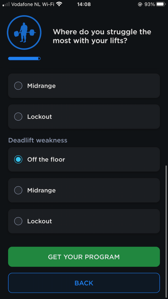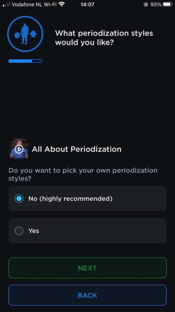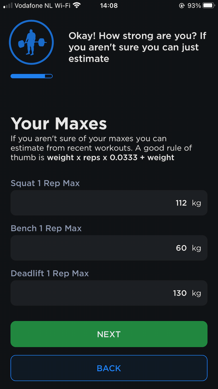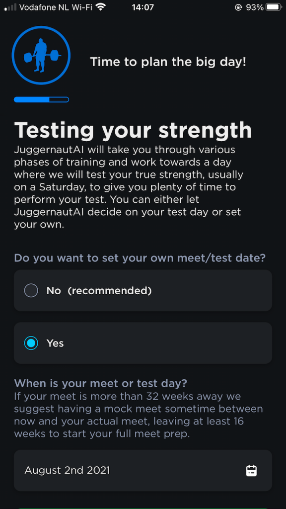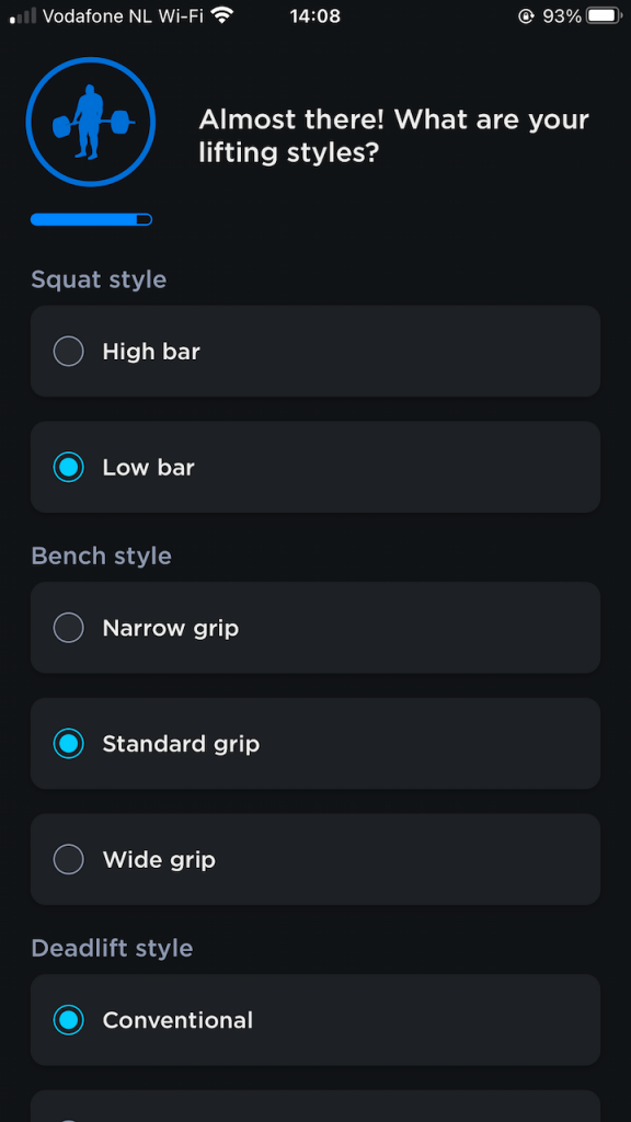 Some other notable questions include “how is your sleep” and “how is your stress”. I loved those questions! If you want to improve your training you’ve got to sleep enough and avoid stress. The app also recommends that you set a date to test your 1RM maxes. I don’t know any powerlifter who doesn’t test their maxes. The app needs this date to calculate the periodization / meso-cycles that you get leading up to your chosen test date. Generally, the further out you are from your test day the more your training is focussed on building up strength. You have time to focus on volume (strength focussed periodization) and when the test day gets closer that changes to intensity, prepping your nervous system to get used to the heavier loads (higher KG on the bar, less repetitions per set).