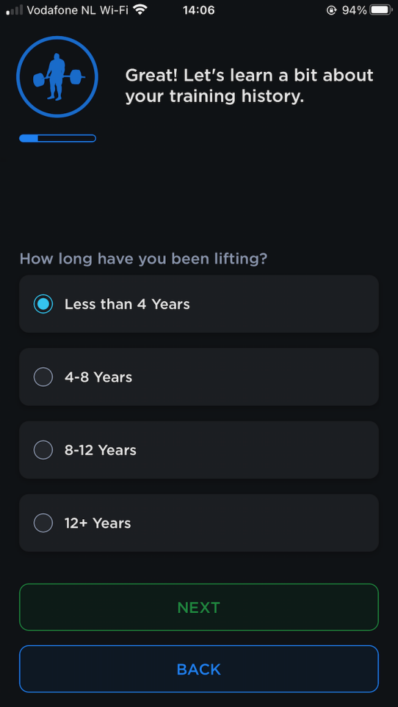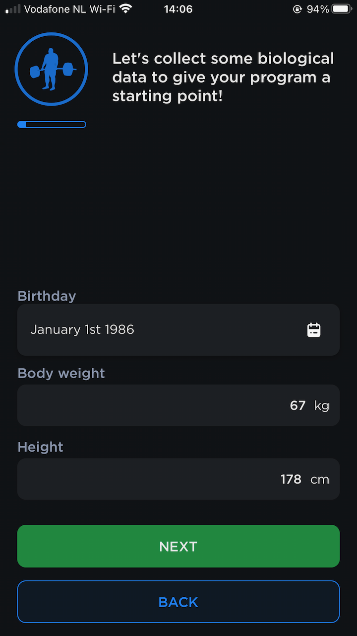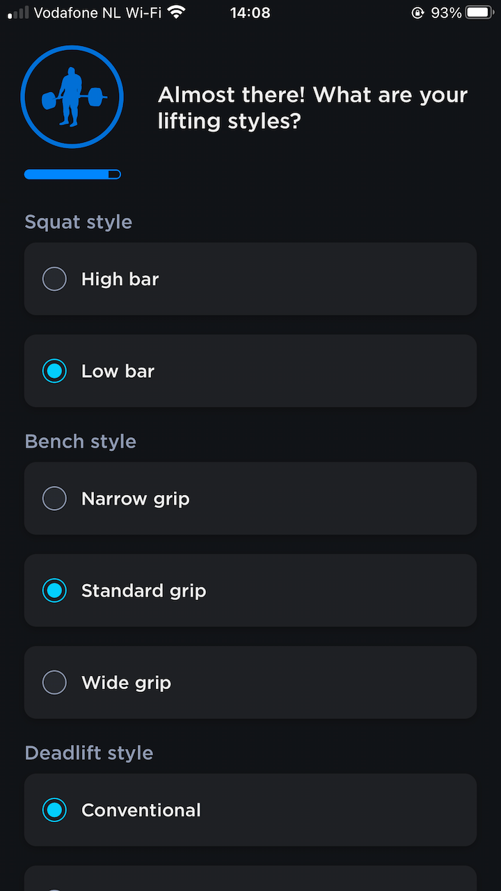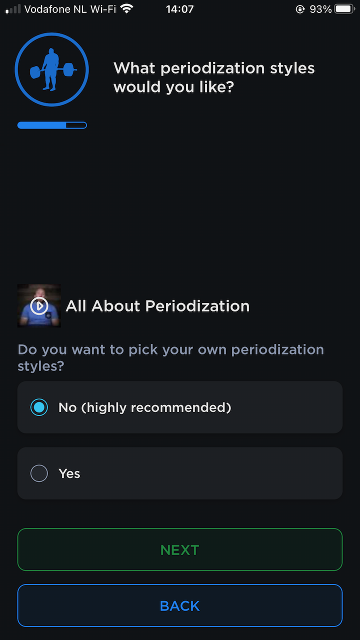 Some other notable questions include “how is your sleep” and “how is your stress”. I loved those questions! If you want to improve your training you’ve got to sleep enough and avoid stress. The app also recommends that you set a date to test your 1RM maxes. I don’t know any powerlifter who doesn’t test their maxes. The app needs this date to calculate the periodization / meso-cycles that you get leading up to your chosen test date. Generally, the further out you are from your test day the more your training is focussed on building up strength. You have time to focus on volume (strength focussed periodization) and when the test day gets closer that changes to intensity, prepping your nervous system to get used to the heavier loads (higher KG on the bar, less repetitions per set).