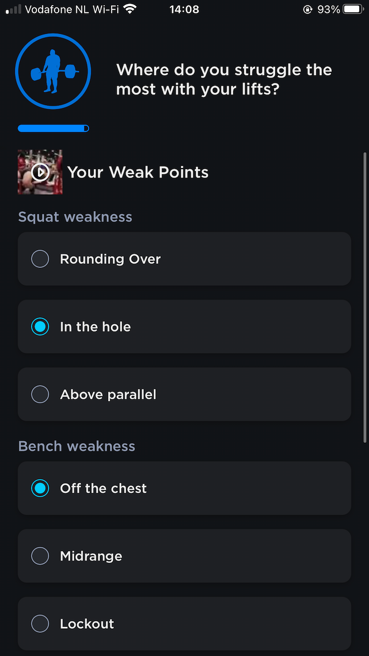 We’re almost there! The most important questions of all: what are your weaknesses? I filled those in and was curious what would be done with it. Now that I’ve done two workouts I know the answer: specific exercises that address those weak points. Because I said my deadlift is weak off the floor I now get to do deficit deadlifts in my workouts. And after the weakness questions I was finally done! This is the point where you get hit by the paywall (UX dark-pattern). The last screenshot is a sneak peak of what you get once you’ve passed the paywall of Mordor.