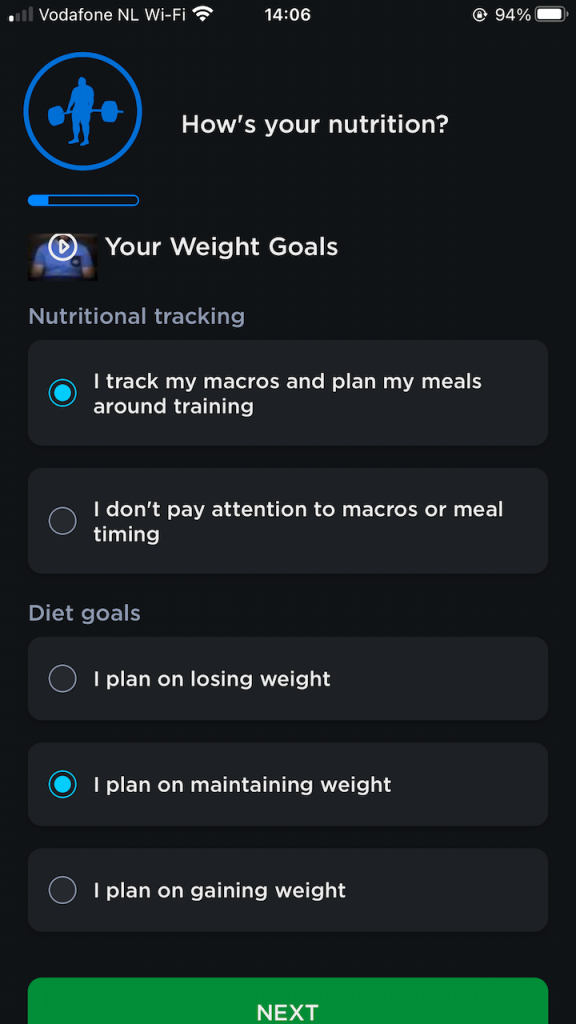 Let’s switch to why the sign-up flow is awesome. Take a look at the first few screens. It starts with really basic stuff, but the first inkling that this is not beginner-friendly can be found when they start asking about your nutrition habits. If you don’t know how to track macros or what macros even are this is your first “wtf” moment. My true answer was not an option “I often track my macros but sometimes I cannot be arsed, tyvm”, so I just went for the “I track my macros”-option.