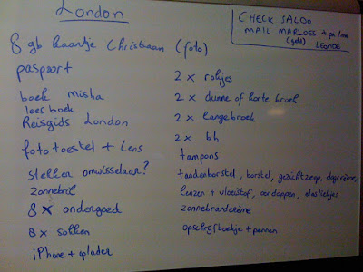 People advised me to make notes to remember stuff. And I do that, and it helps a little. Usually, I get my more lucid moments when I’m lying in bed trying to fall asleep and then I’m too lazy to make a note, wishfully thinking I’ll remember it the next morning. Which of course, never happens. So a few weeks ago I bought a whiteboard, to scrabble down things that I need to remember. For London I’m trying this new tactic of making a list with the things that I need to pack. It looks like this