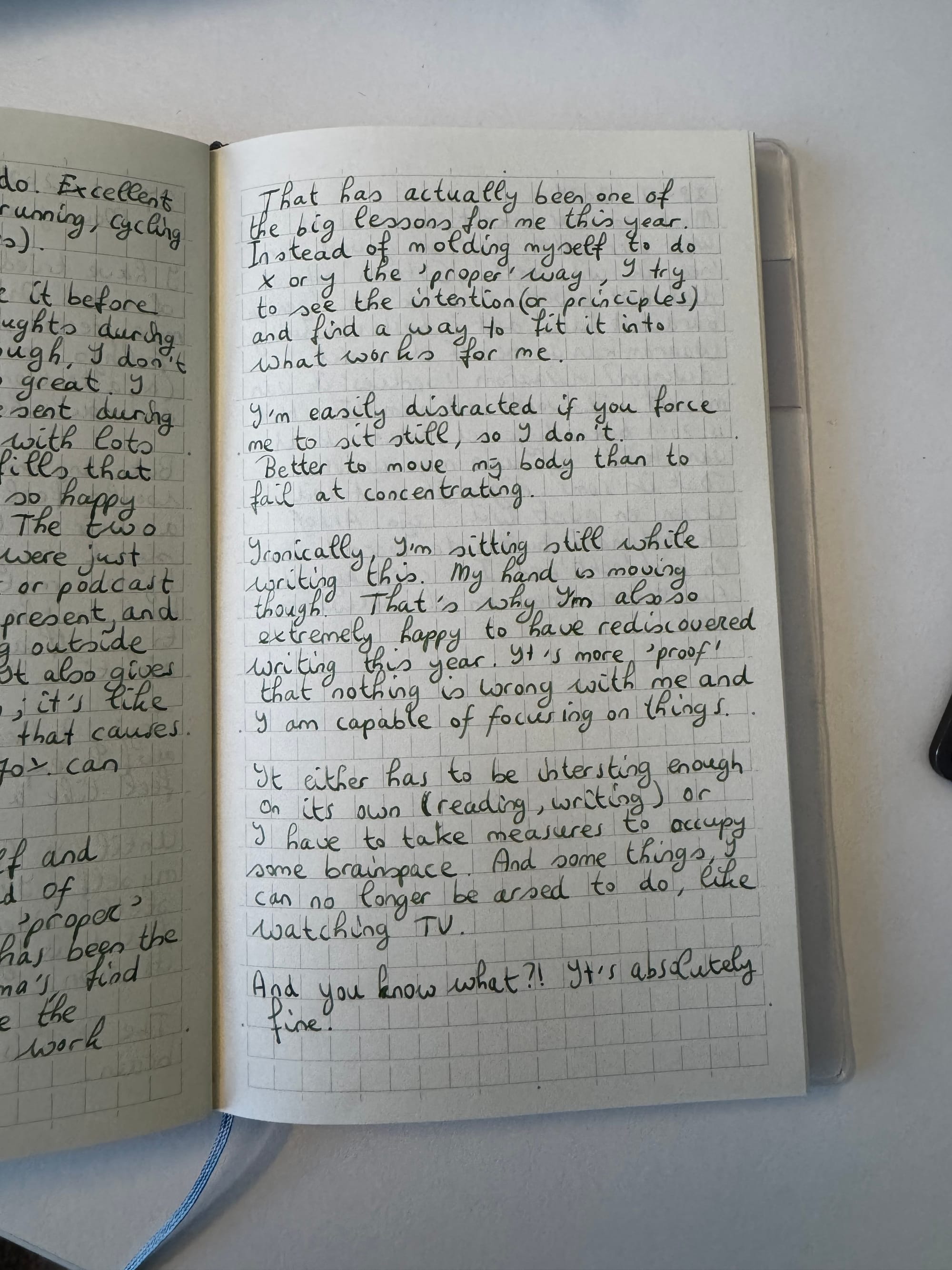 Ironically, I'm sitting still while writing this. My hand is moving, though. That's why I'm also so extremely happy to have rediscovered writing this year. It's more proof that nothing is wrong with me and that I am capable of focusing on things.