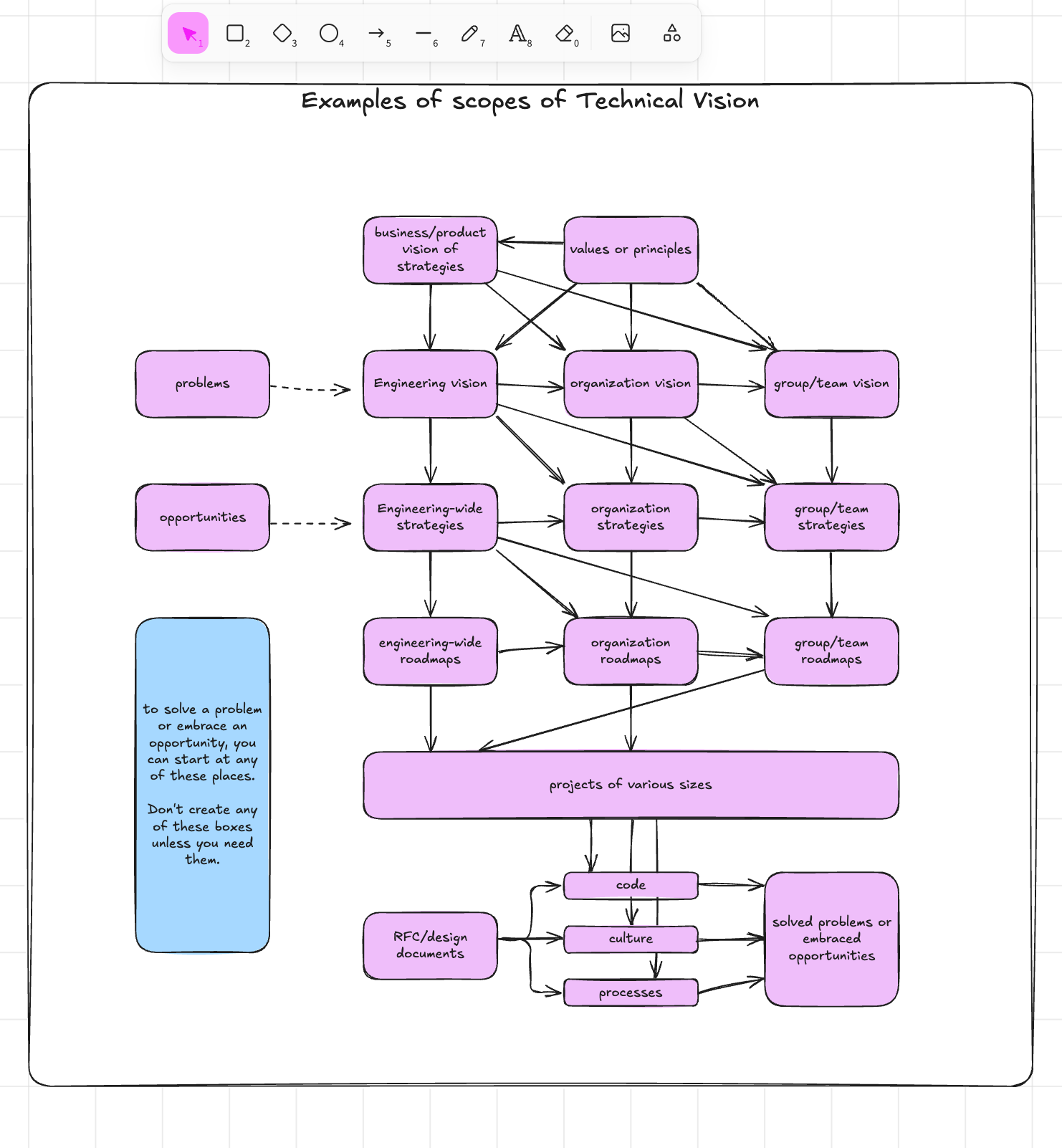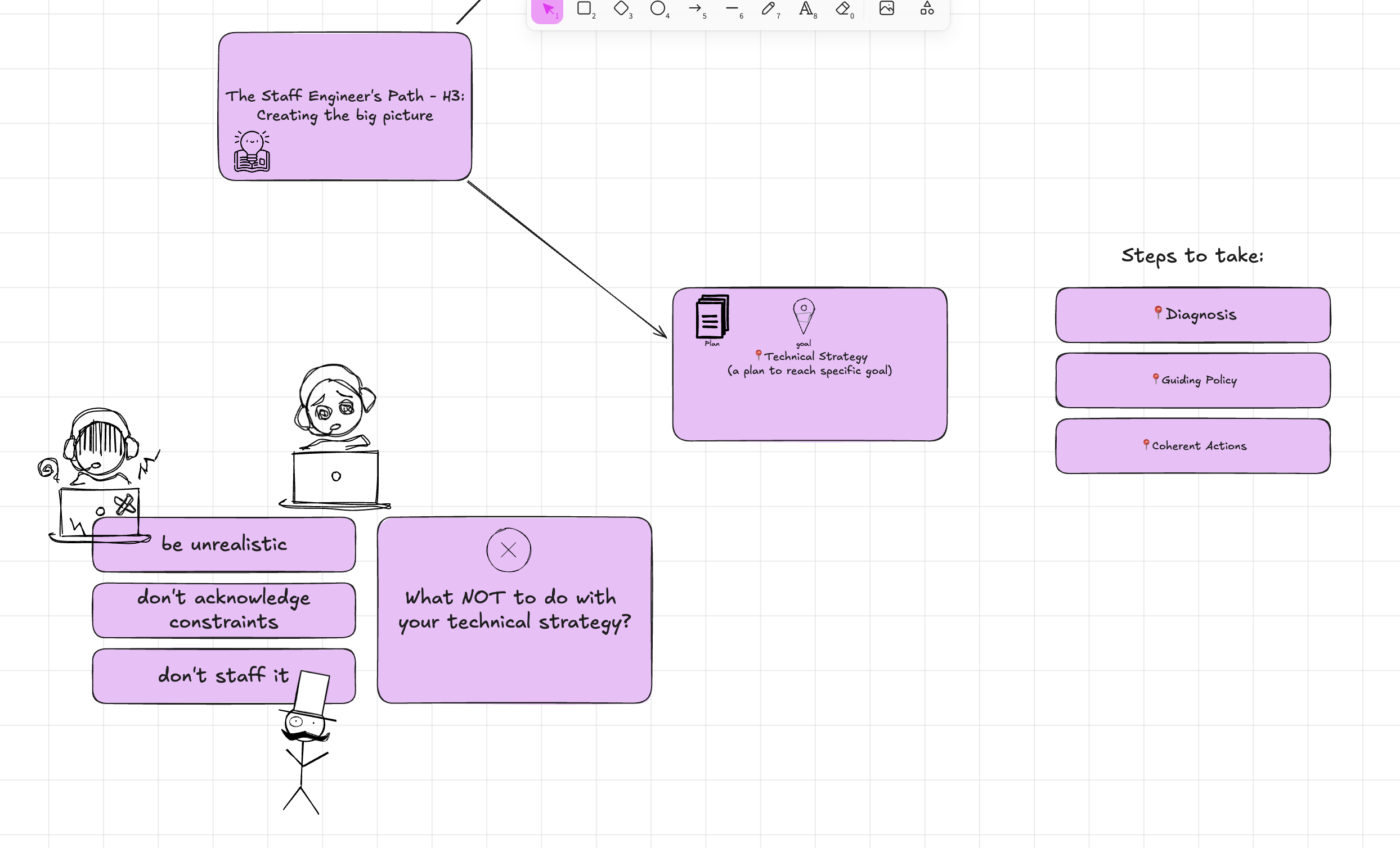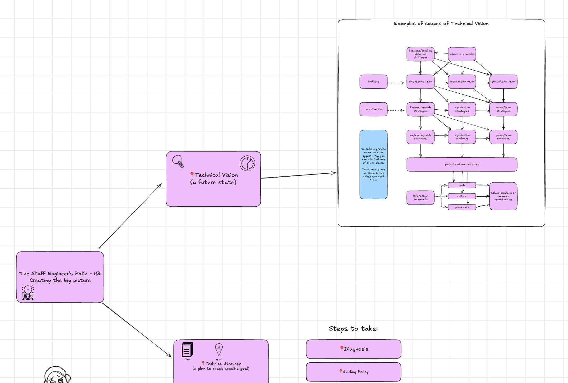 For my IT job, I'm currently reading the book The Staff Engineer's Path by Tanya Reilly. I finished reading chapter 3 and I figured I could practice visual thinking with my notes.
