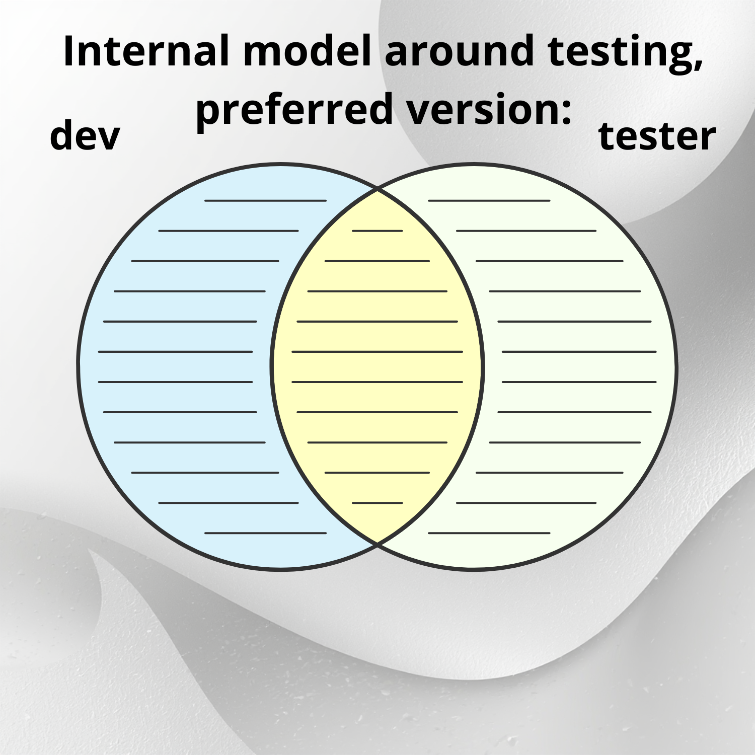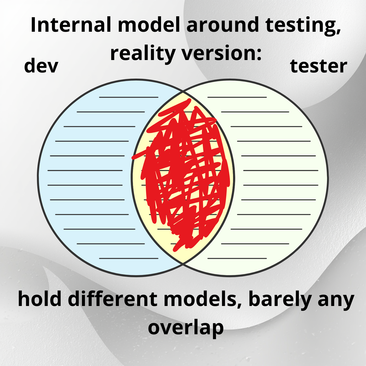 Let's go to this situation, shall we? Developers and testers should have at least a part of a shared internal model around what testing is and isn't. It's time for developers to be less wrong about testing, and to update their internal models.