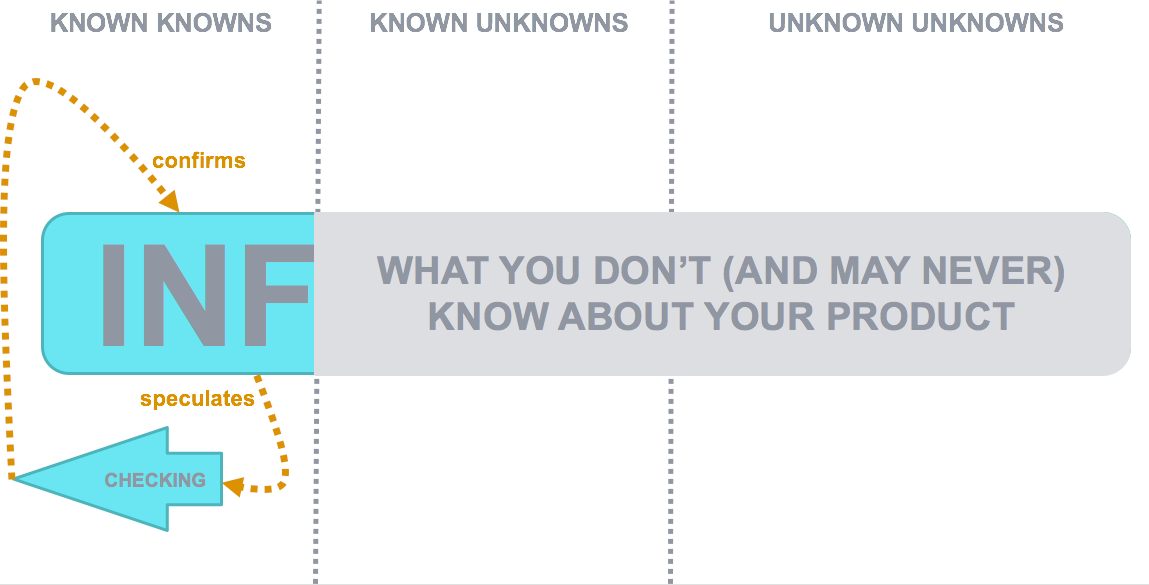 In the process of software development, we are searching for information. This information can confirm or deny that we're going in the right direction (solving problems that the business wants to be solved, to put it succinctly). This information comes in three domains: known-knowns, known-unknowns, unknown-unknowns.